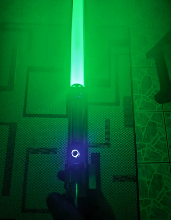 Para cambiar el color del sable: pulsa el botón del mango una vez.